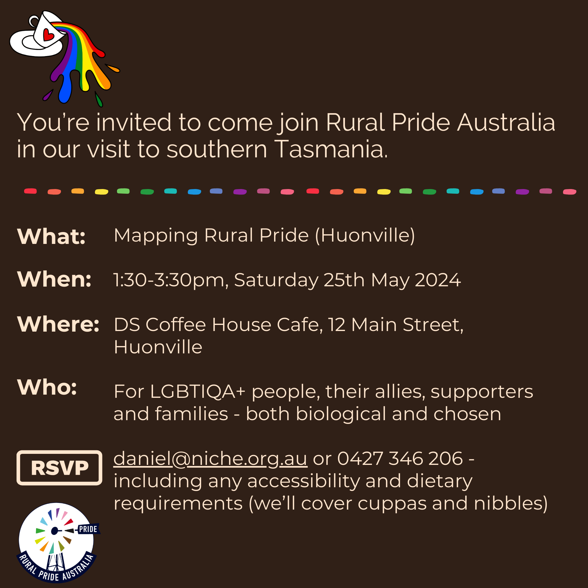 Rural Pride Australia came to the HuonValley, on the Melukerdee and Lyluequonny country, on Saturday 25th May and Sunday 26th May 2024. A national mapping workshop was held on Saturday 25th May2024 at DS Coffee House, Huonville. Our thanks to owners Dave and Steve for their support.